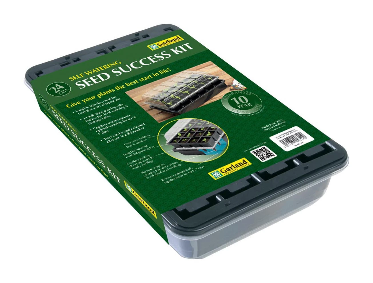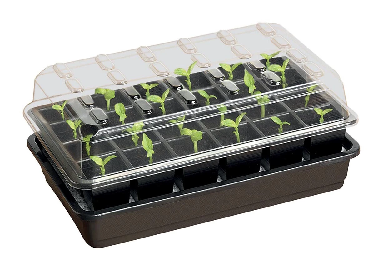 Zimmergewächshäuser sind eine tolle Erfindung. Sie ermöglichen es allen Menschen, auch mit wenig oder keinen Vorkenntnissen, Pflanzen aus Samen zu ziehen. Und das im eigenen Zuhause, in der Küche, dem Gewächshaus, oder dem Garten. Die kleinen Plastikboxen bieten den Samen eine komfortable Umgebung, sorgen für das optimale Klima unter der Haube und lassen Ihre Pflanzen schnell und kräftig wachsen. Das Einzige, um das Sie sich noch kümmern müssen, ist eine stetige Bewässerung. Aber nicht so mit dem Garland 24 Cell Self Watering Seed Sucess Kit. Das übernimmt die Bewässerung nämlich ganz von selbst und nutzt dafür ein simples, aber effektives System, das in der Hydroponik als Dochtsystem bekannt ist. Die Anzuchtschale mit den Pflanzen steht auf einer erhöhten Plattform über einem Wasserreservoir. Zwischen Plattform und Anzuchtschale befindet sich eine Kapillarmatte, über die die Pflanzen von selbst, über die Wurzeln, Wasser aufsaugen können, wenn sie es benötigen. Das 5- teilige Set enthält eine Reservoir Schale, eine Stützplattform, eine Kapillarmatte und eine 24 Zellen Anzuchtschale mit den Maßen 5 cm x 4,7 cm x 5,8 cm und einem Fassungsvermögen von 0,1 l. Außerdem die passende durchsichtige Haube, unter der das perfekte Klima entsteht, damit Ihre Pflanzen schnell und kräftig wachsen. Dieses Garland Zimmergewächshaus hat die perfekte Größe für eine Fensterbank und findet auch sonst überall einen Platz. Die Anzuchtschale kann mehrere Jahre wiederverwendet werden und nach einer Anzuchtphase ganz einfach in der Spülmaschine gereinigt werden.