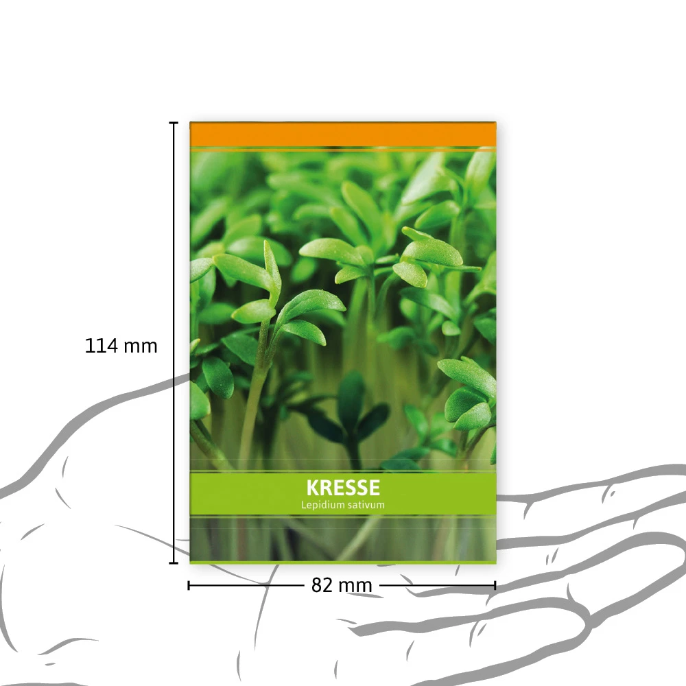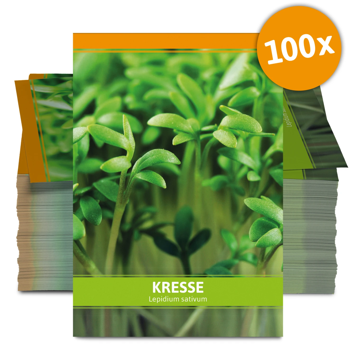 Würzige Gartenkresse kann jeder anbauen. Mit 100 Samentütchen Gartenkresse können Sie Freunde, Bekannte, Geschäftspartner und Gäste überraschen. Die kleinen Samentütchen sind ein beliebtes Gastgeschenk. Die Samentüte ist zeitlos schön und ansprechend gestaltet. Mit einem Aufkleber können Sie Ihr Logo, eine kleine Werbe-Botschaft oder ein Dank aufbringen. Bei dem köstlichen Geschmack werden die Beschenkten sich immer an Sie erinnern.