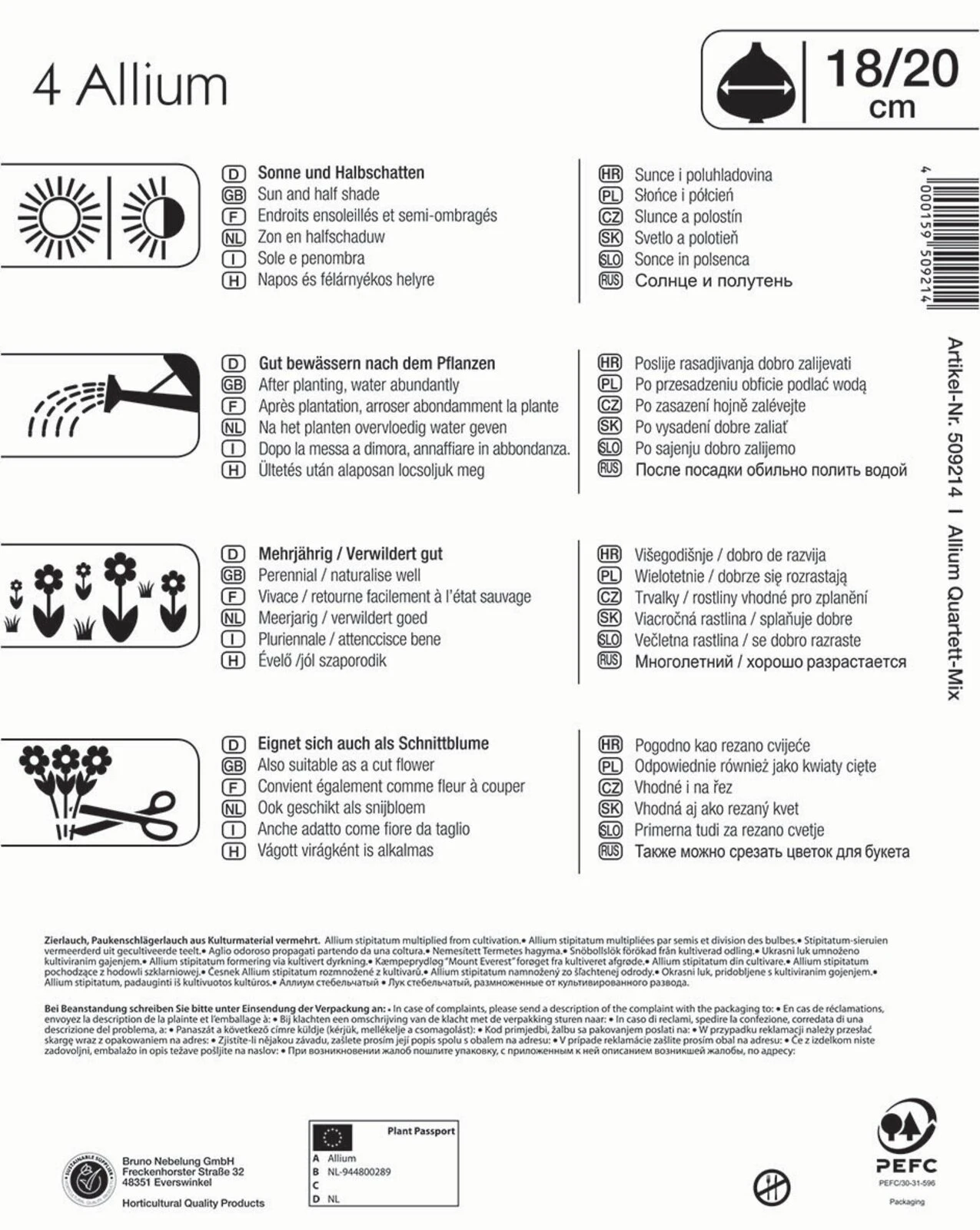 Das Mega-Pack „Zierlauch Großblumige Mischung“ enthält je eine Zwiebel der Zierlauchsorten ‚Gladiator‘, ‚Mount Everest‘, ‚Pinball Wizard‘ und ‚Mars‘. ‚Pinball Wizard‘ wird etwa 120 cm hoch und blüht im Juni und Juli. ‚Gladiator‘ wird ebenfalls rund 120 cm hoch und entfaltet im Juli seine violetten Blütenstände. ‚Mars‘ hingegen blüht im Mai und Juni und wird ca. 110 cm hoch. ‚Mount Everest‘ wiederum ist ein weiß blühender Zierlauch, der eine Wuchshöhe von 100 cm erreicht und schon ab Mai blühen kann. An ungestörten Standorten verwildern die Pflanzen gut und vermehren sich durch Samen selbst. Die Blütenstiele können blühend und getrocknet für Sträuße und Gestecke verwendet werden. Aufgrund der unzähligen kleinen Einzelblüten, die zusammen die imposanten Blütenbälle bilden, ist dieser Mix ein Eldorado für Bienen und anderen Insekten.