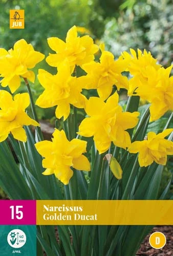 Doppelte goldene Narzissen. Sehr gut geeignete Narzissen zum Verwildern. Golden Ducat ist schön im Beet, aber auch in Töpfen auf der Terrasse oder dem Balkon. Schön zu kombinieren mit Hyazinthen und Tulpen.