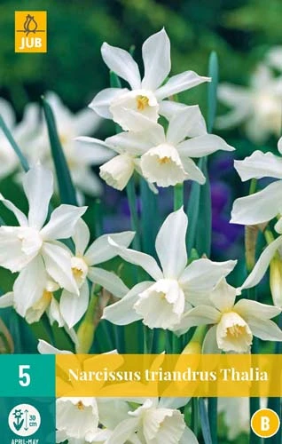 Thalia ist eine anmutige mehrblumige Narzisse mit einem wunderbaren Duft. Sowohl die Blume als auch die Tasse sind cremeweiß. Drei bis vier Blüten pro Stiel. Gut kombinierbar mit anderen Frühlingszwiebeln. Es ist eine sehr geeignete Narzisse zum Einbürgern. Schön im Beet, aber auch in Töpfen auf der Terrasse oder dem Balkon.