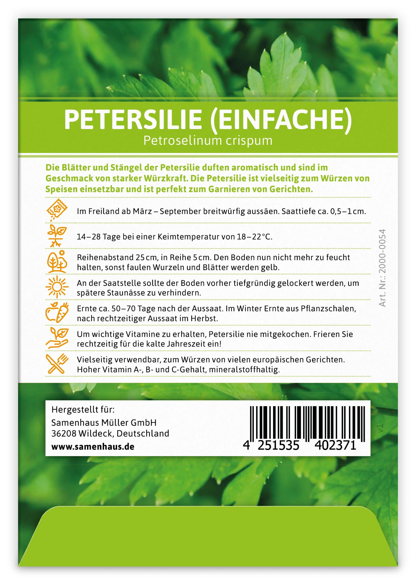 Die Blätter und Stängel der Petersilie duften aromatisch und sind im Geschmack von starker Würzkraft. Die Petersilie ist vielseitig zum Würzen von Speisen einsetzbar und ist perfekt zum Garnieren von Gerichten.
