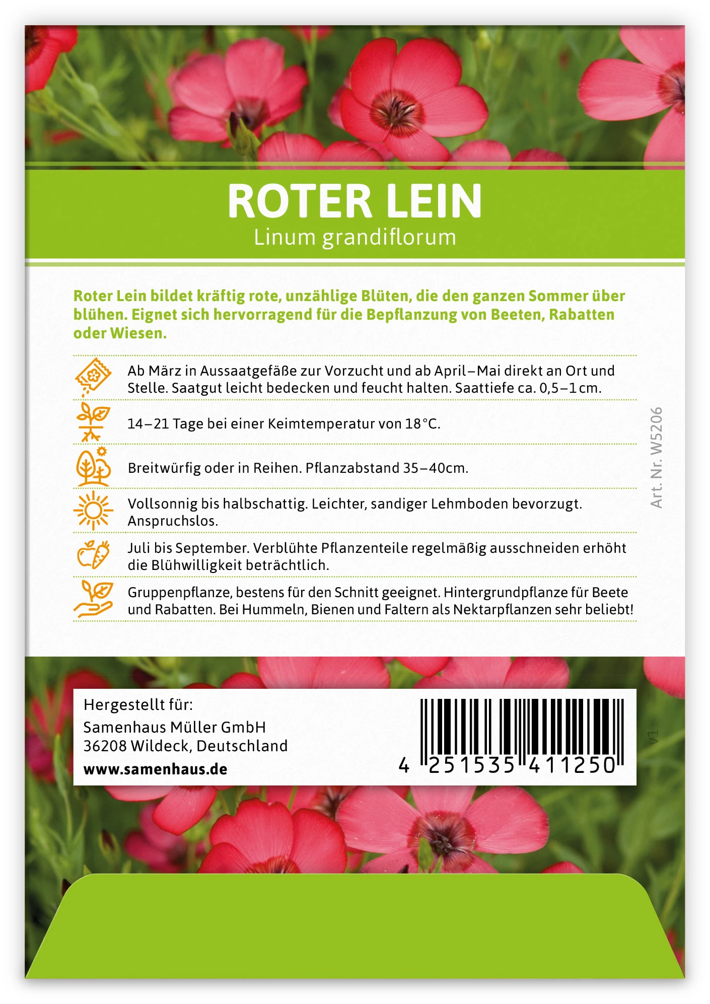 Die seidigen, kleinen Blüten des Roten Lein setzen in jedem Blumenbeet Akzente. Lückenbüßer sind die Blumen auf keinen Fall. Die essbaren Blüten sind auch für Insekten eine wichtige Nahrungsquelle. Verschenken Sie ein Stück Natur als Give-Away und lassen sich die wunderschönen Samentütchen Ihre Werbebotschaft verbreiten. Ihr Logo können Sie einfach mit einem Aufkleber aufbringen.