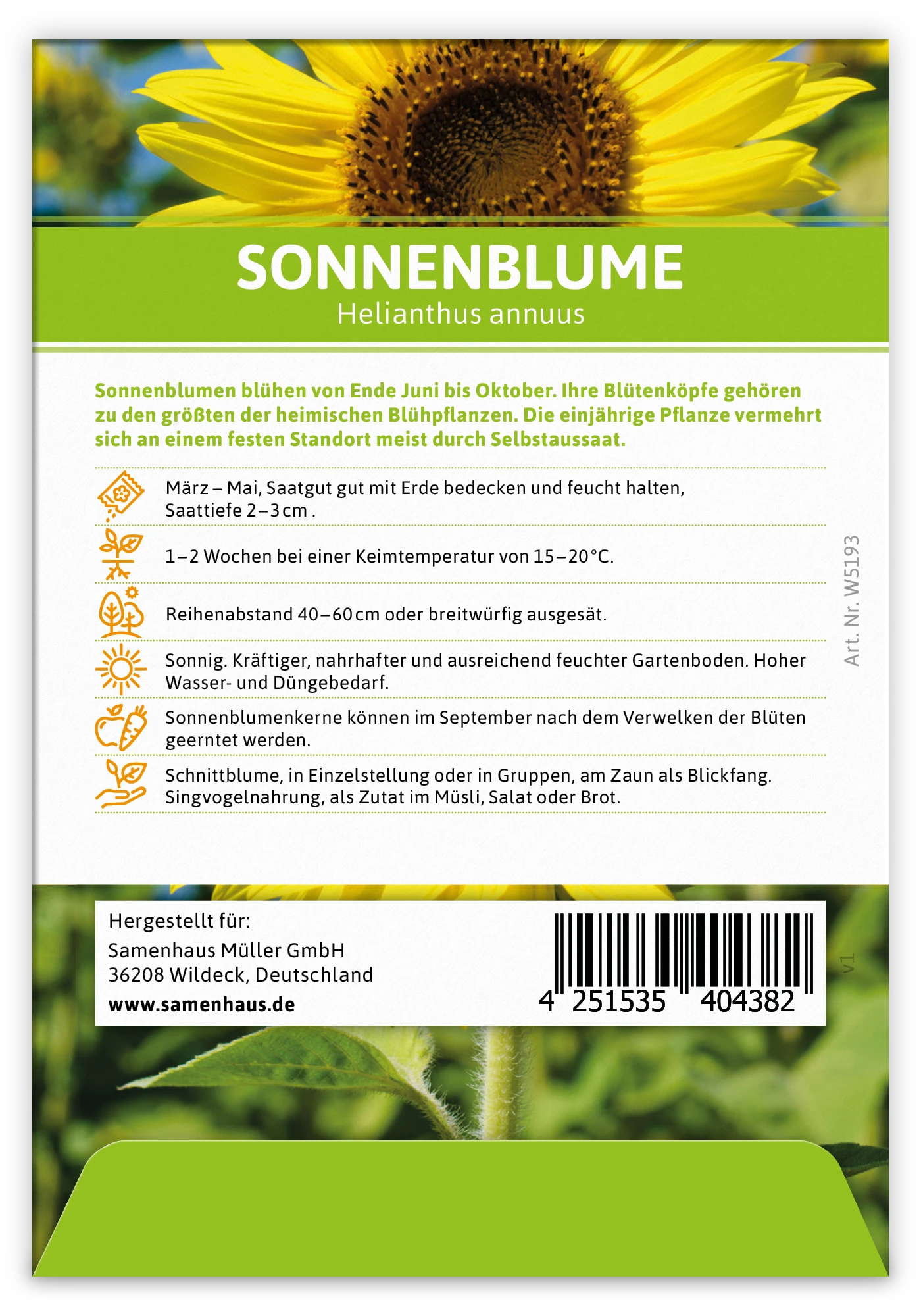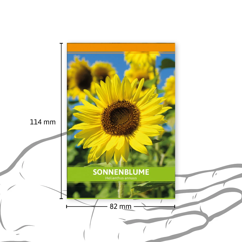 Sie haben eine große Feier oder eine Werbeaktion geplant und möchten mit einem Give-Away in den Gedanken Ihrer Kunden und Gäste bleiben? Dann sind 100 Samentütchen mit dem Samen der Sonnenblumen ein tolles Geschenk. Wenn die Samen bei Ihren Gästen aufgehen und riesige Sonnenblumen hervorbringen, wird man an Sie und Ihre Aktion denken. Schon auf der Samentüte ist zu sehen, was zu erwarten ist. Bei Werbeaktionen können Sie mit einem Aufkleber die Tüten individualisieren.