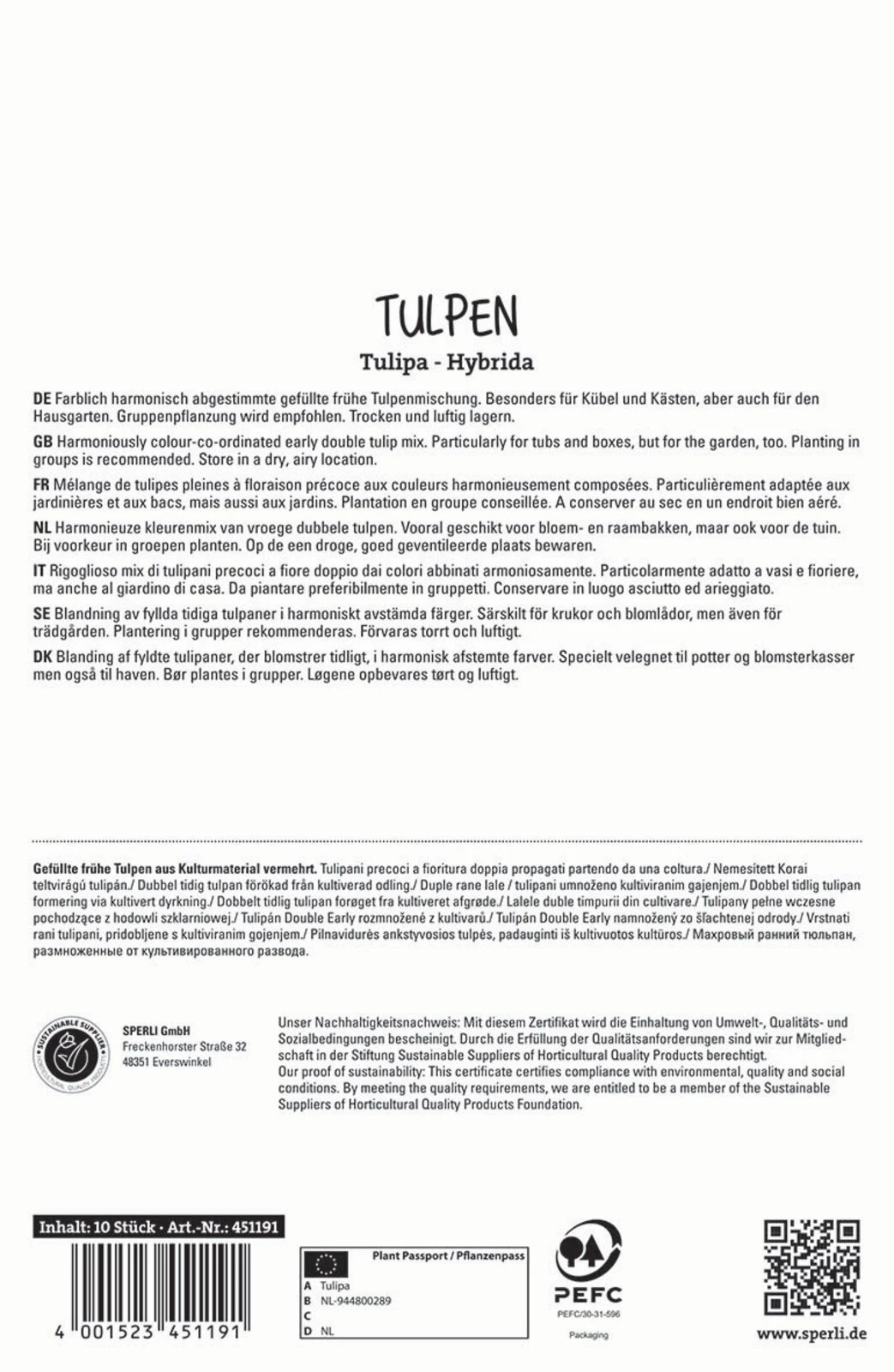 Farblich harmonisch abgestimmte gefüllte frühe Tulpenmischung. Besonders für Kübel und Kästen, aber auch für den Hausgarten. Gruppenpflanzung wird empfohlen.Trocken und luftig lagern.