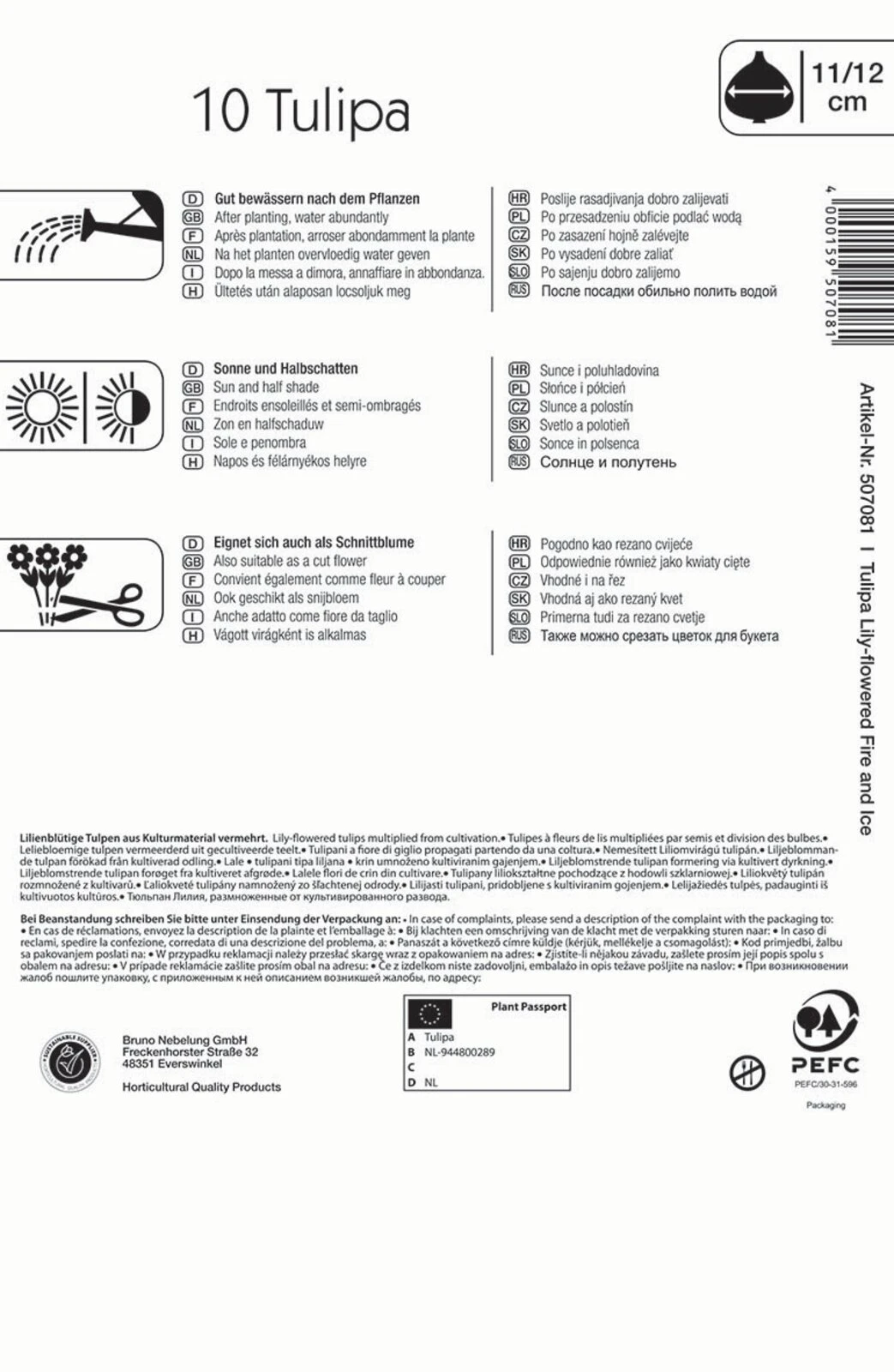 Der Tulpen-Mix „Fire and Ice“ ist eine attraktive Mischung aus lilienblütigen Tulpen in roter und weißer Farbe. Die mehrjährigen, winterharten Pflanzen stehen im Mai in herrlicher Blüte. Vor allem an sonnigen und halbschattigen Standorten fühlen sie sich wohl und erreichen eine Wuchshöhe zwischen 40 und 50 cm. Die „Fire and Ice“-Mischung kann sowohl in Beeten, Rabatten und Einfassungen als auch in Töpfen, Kästen und Hochbeeten herangezogen werden. Die Tulpen machen überall eine gute Figur und können darüber hinaus auch geschnitten und in die Vase gestellt werden.