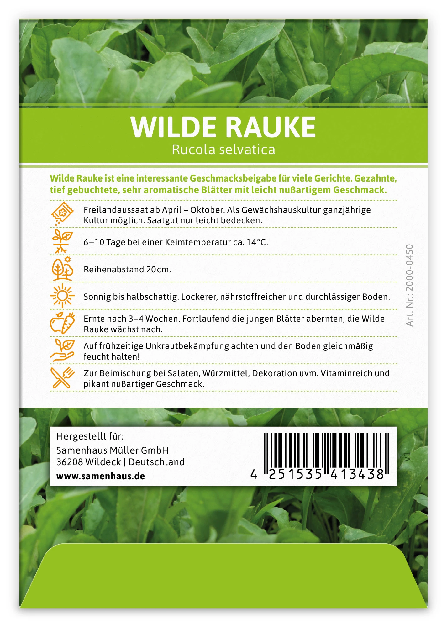 Ernte nach 3–4 Wochen. Laufend die jungen Blätter abernten, die Wilde Rauke wächst laufend nach.